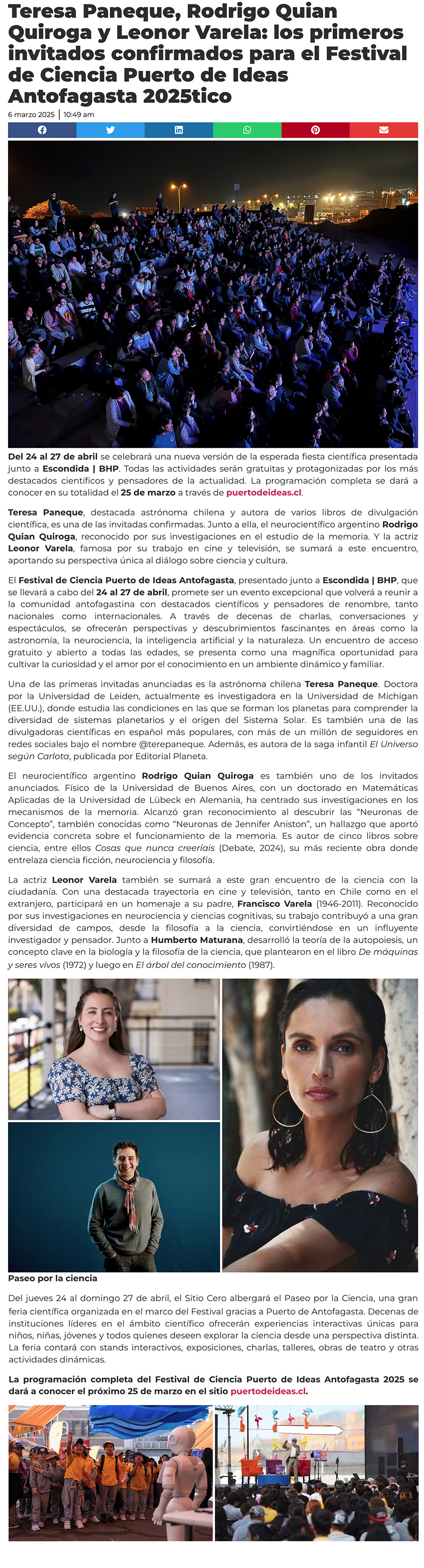 Teresa Paneque, Rodrigo Quian Quiroga y Leonor Varela: los primeros invitados confirmados para el Festival de Ciencia Puerto de Ideas Antofagasta 2025 - (cpcomunicaciones.cl)