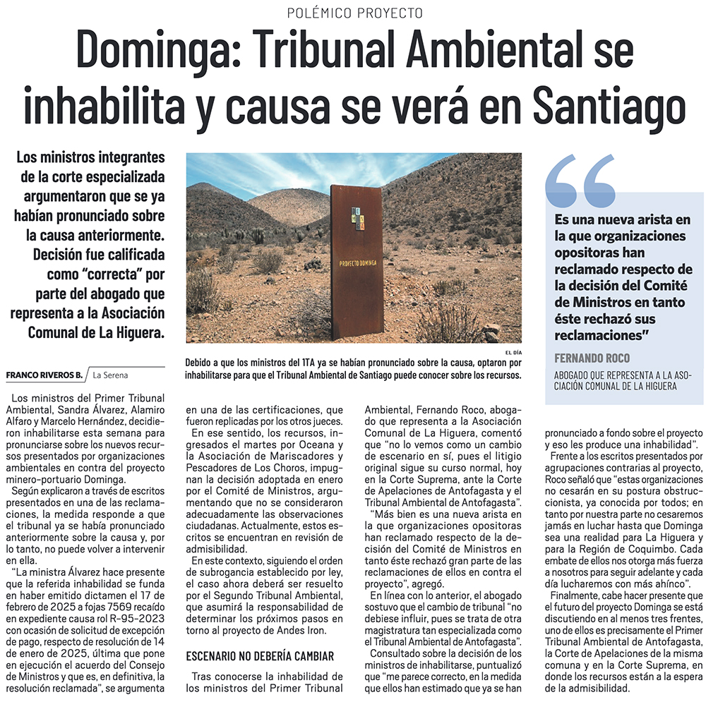 Tribunal Ambiental de Antofagasta se inhabilita y remite recursos contra Dominga a Santiago - (El Día)