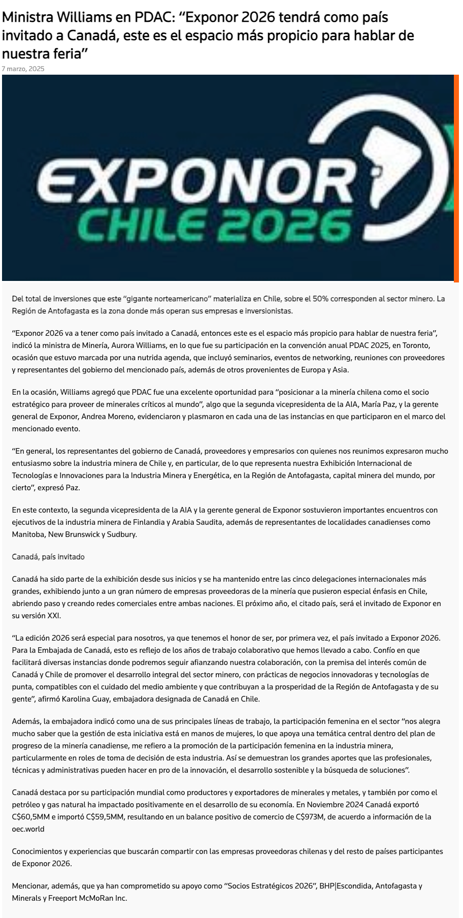 Ministra Williams:“Exponor 2026 tendrá como país invitado a Canadá” - (reporteminero)