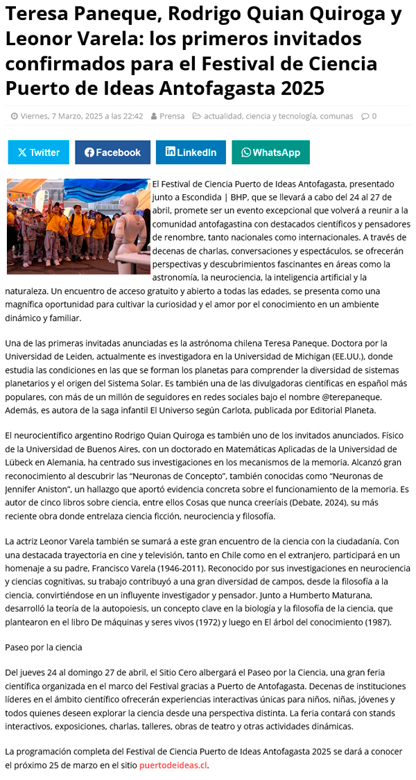 Teresa Paneque, Rodrigo Quian Quiroga y Leonor Varela estarán en Puerto de Ideas Antofagasta - (El Mostrador)