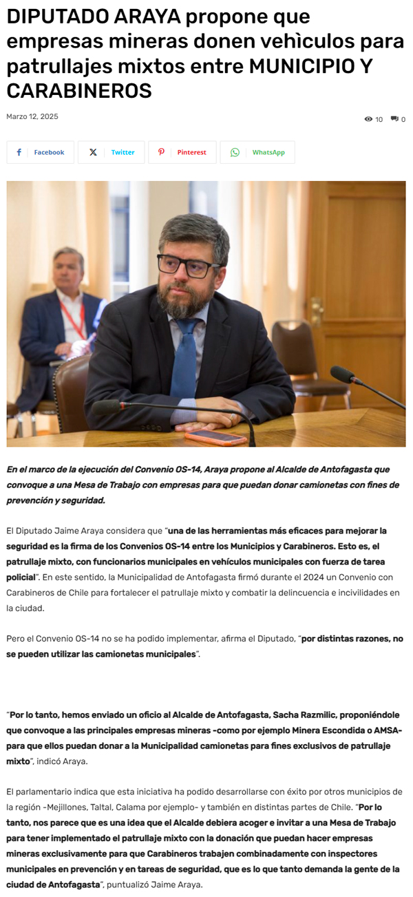 Diputado Araya pidió a alcalde solicitar camionetas a mineras para patrullajes mixtos en Antofagasta - (soyantofagasta)