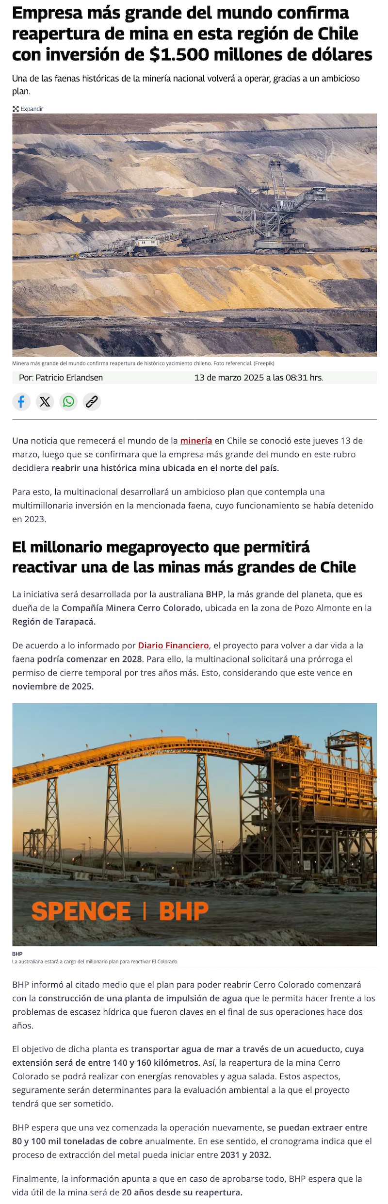 BHP entrega primeros lineamientos de proyecto de reapertura de Cerro Colorado - (mch.cl)