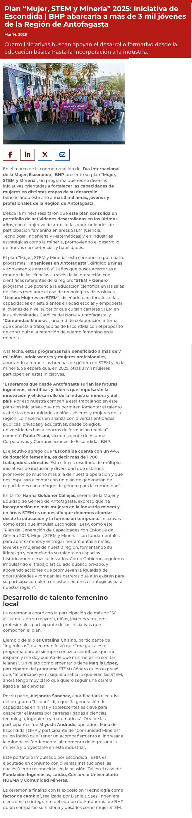Escondida | BHP lanzó plan “Mujer, STEM y Minería” 2025: abarcaría a más de 3 mil jóvenes de la región - (mvcomunicaciones.cl)
