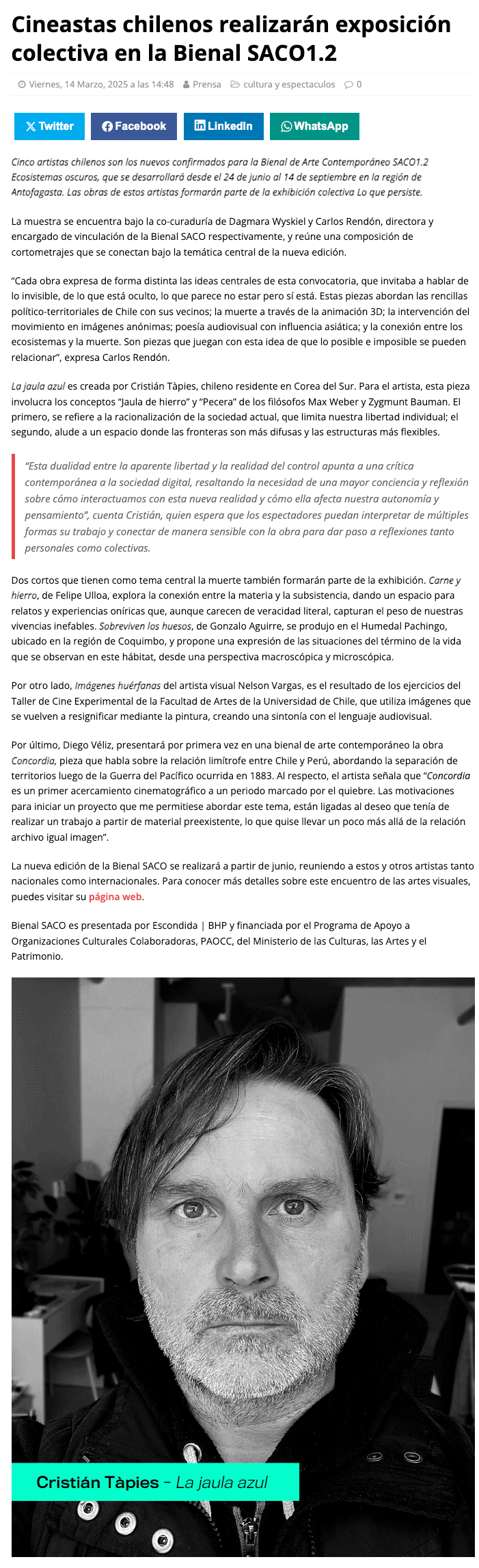 Cinco artistas chilenos son los nuevos confirmados para la Bienal de Arte Contemporáneo SACO1.2 - (antofacity.com)