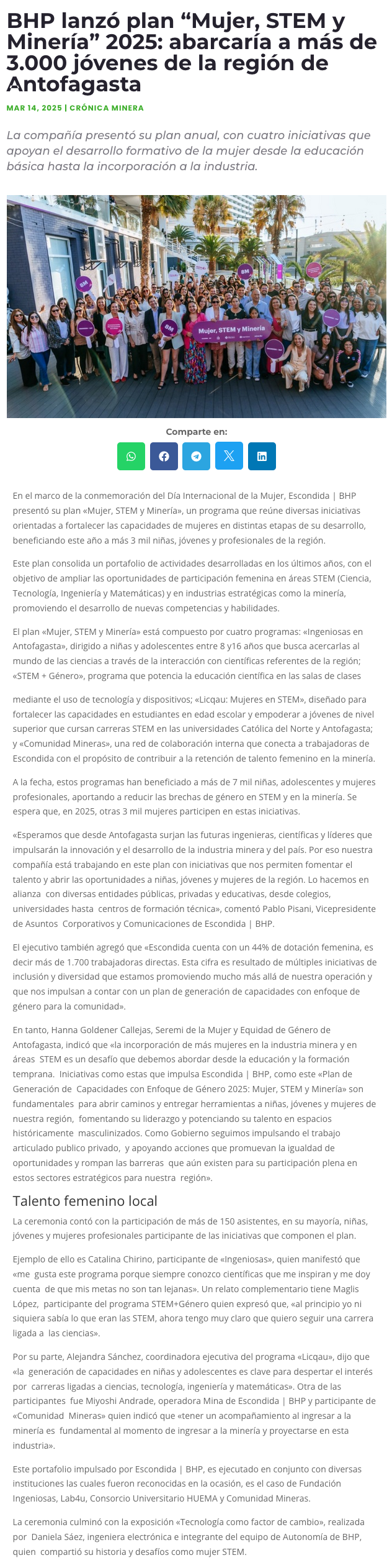 Escondida | BHP lanzó plan “Mujer, STEM y Minería” 2025: abarcaría a más de 3 mil jóvenes de la región - (mvcomunicaciones.cl)