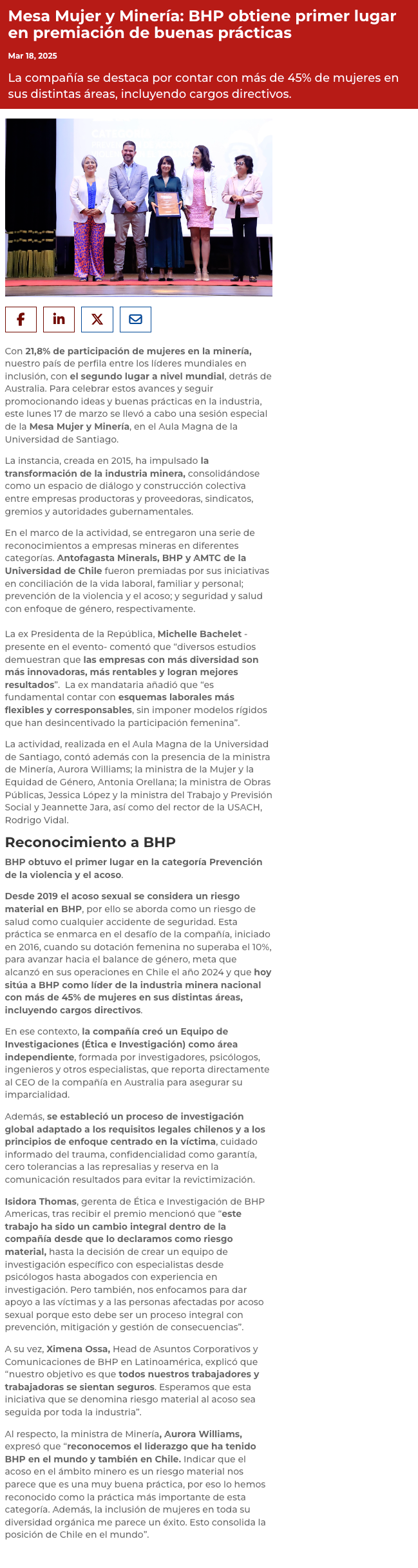 Mesa Mujer y Minería celebra 10 años premiando a empresas con buenas prácticas de equidad e inclusión en minería - (nuevaminería online)