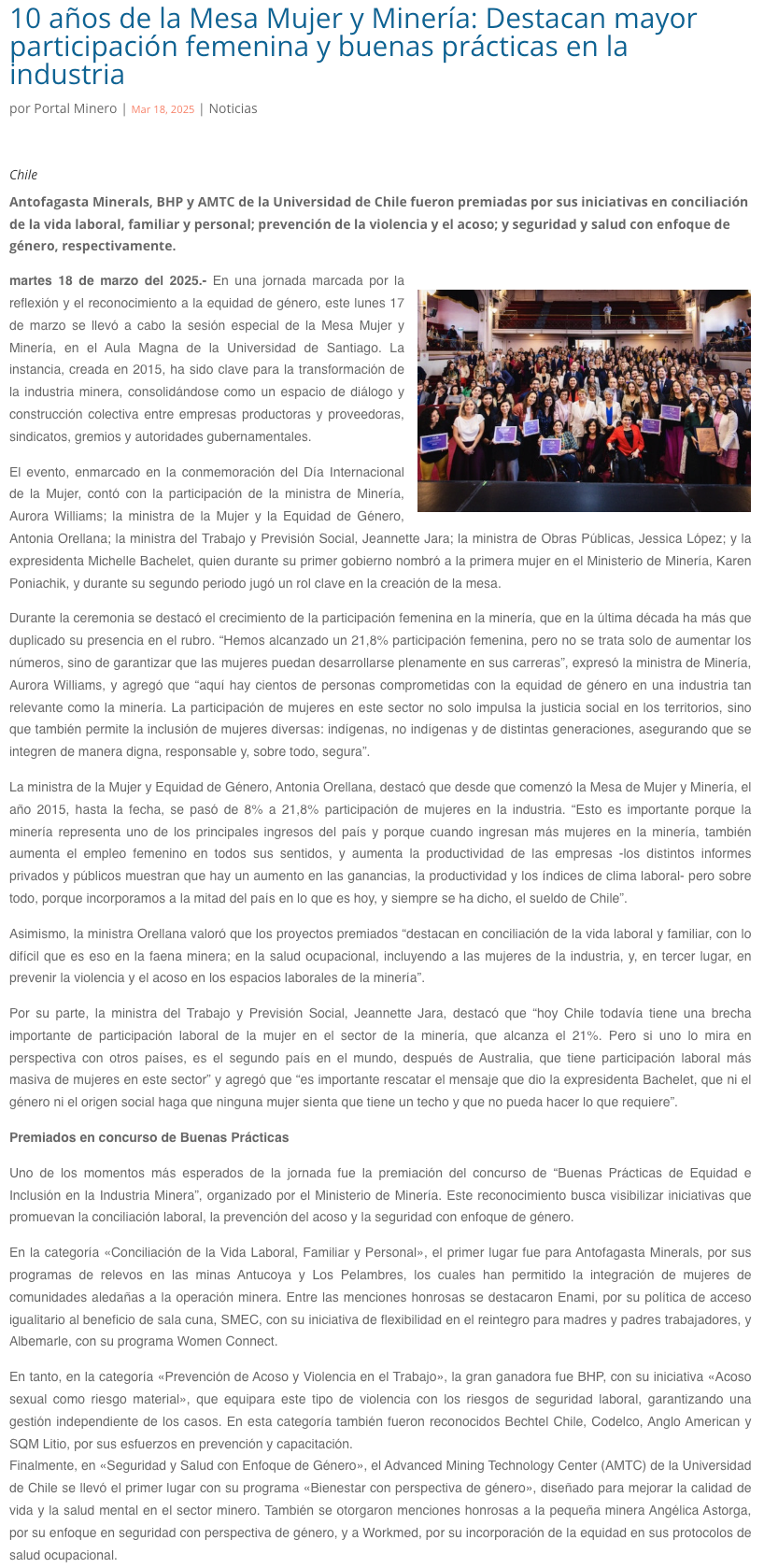 Mesa Mujer y Minería: BHP obtiene primer lugar en premiación de buenas prácticas - (mch.cl)