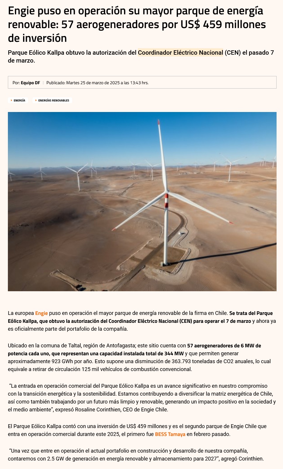Francesa Engie comienza operación de su mayor parque de energía renovable en Chile: tuvo una inversión de US$459 millones - (La Tercera Online)