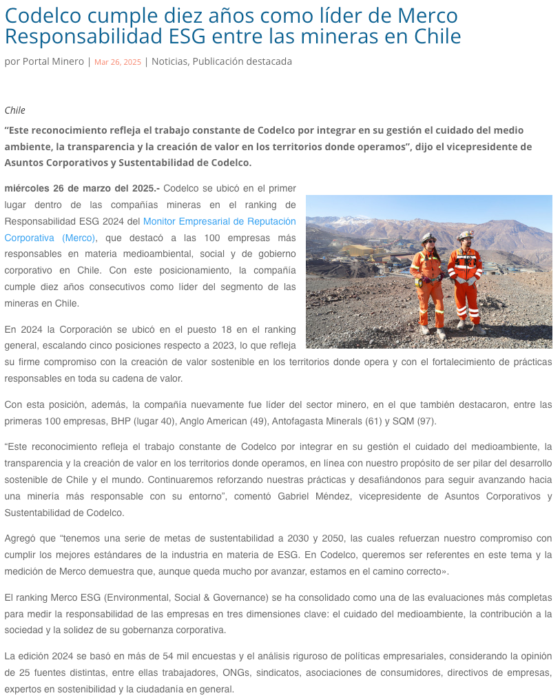 Codelco cumple diez años como líder de Merco Responsabilidad ESG entre las mineras en Chile - (redimin)
