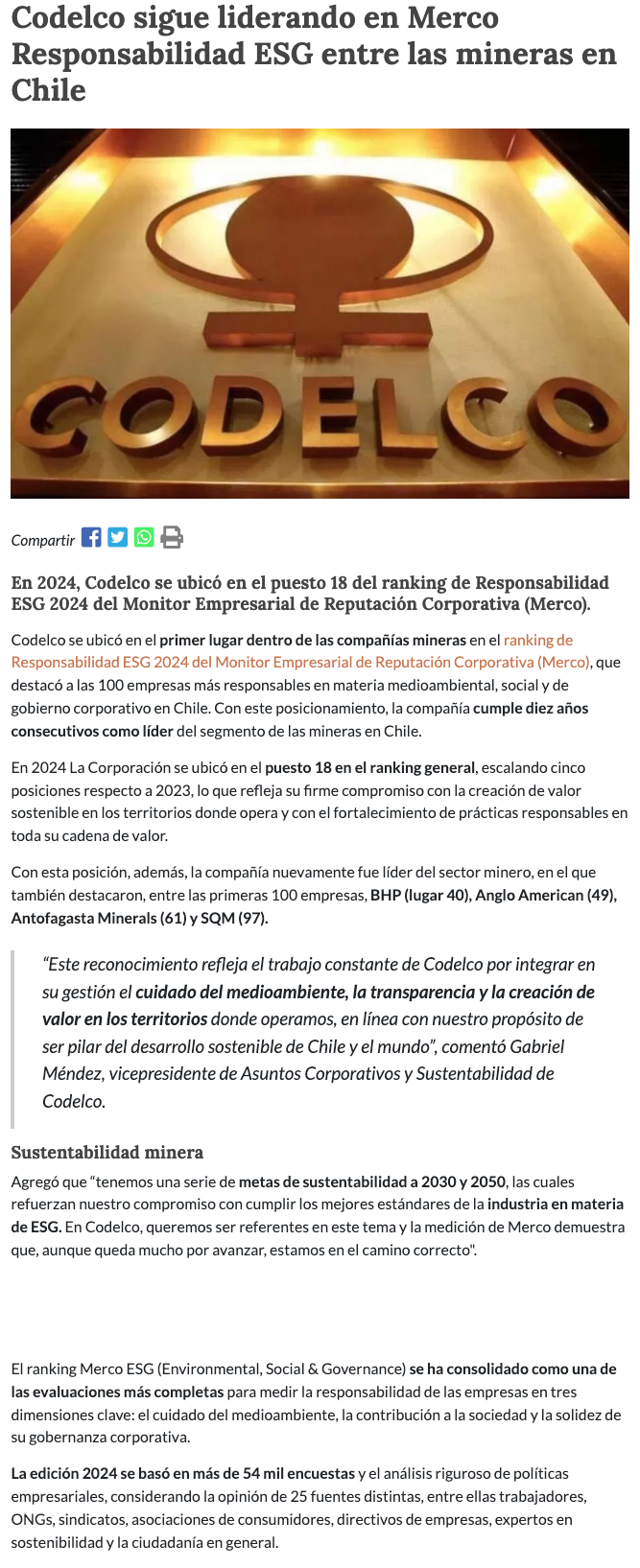Codelco cumple diez años como líder de Merco Responsabilidad ESG entre las mineras en Chile - (portalminero)