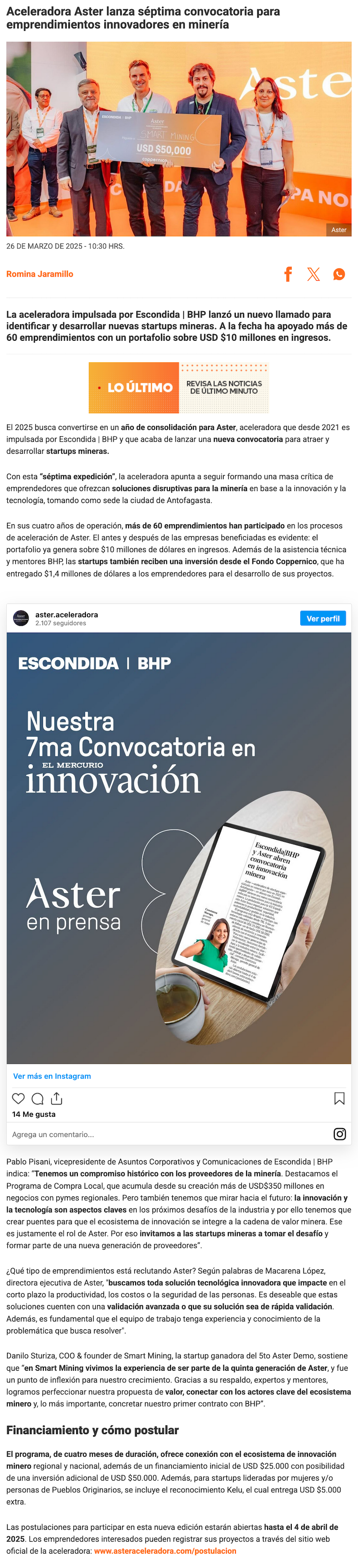 Aceleradora Aster lanza séptima convocatoria para emprendimientos innovadores en minería - (soyantofagasta)