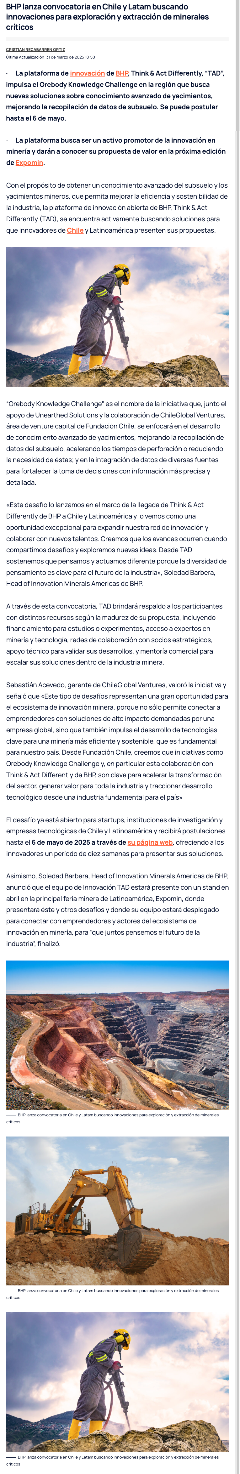 BHP lanza convocatoria en Chile y Latam buscando innovaciones para exploración y extracción de minerales críticos - (mch.cl)