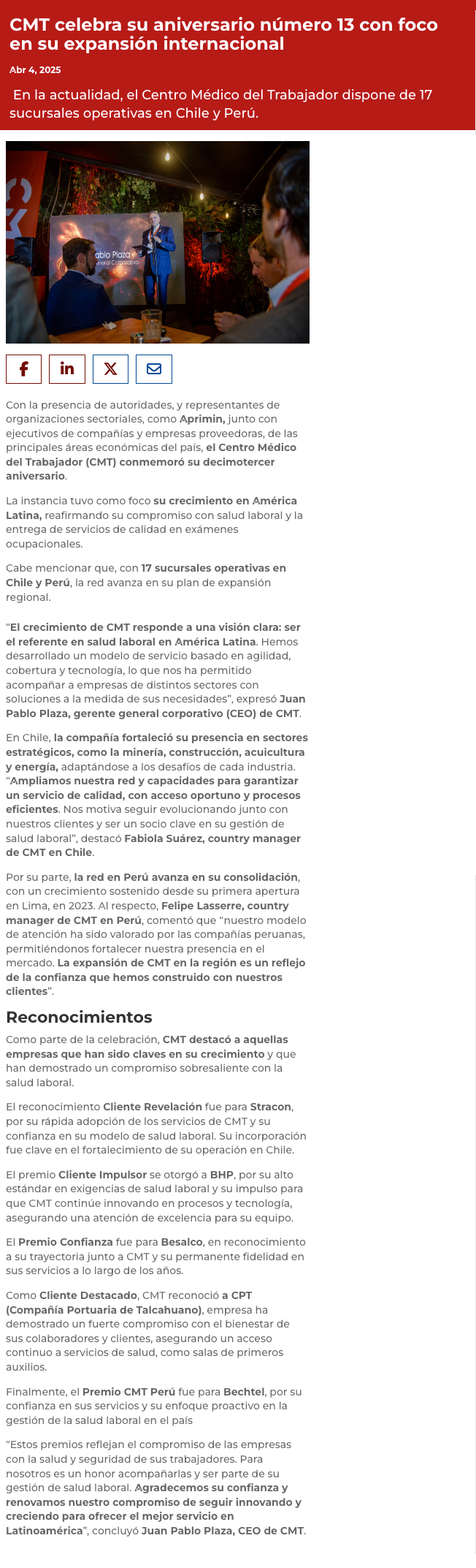 Centro Médico del Trabajador celebra su aniversario con expansión histórica en Latinoamérica - (Diario Financiero)