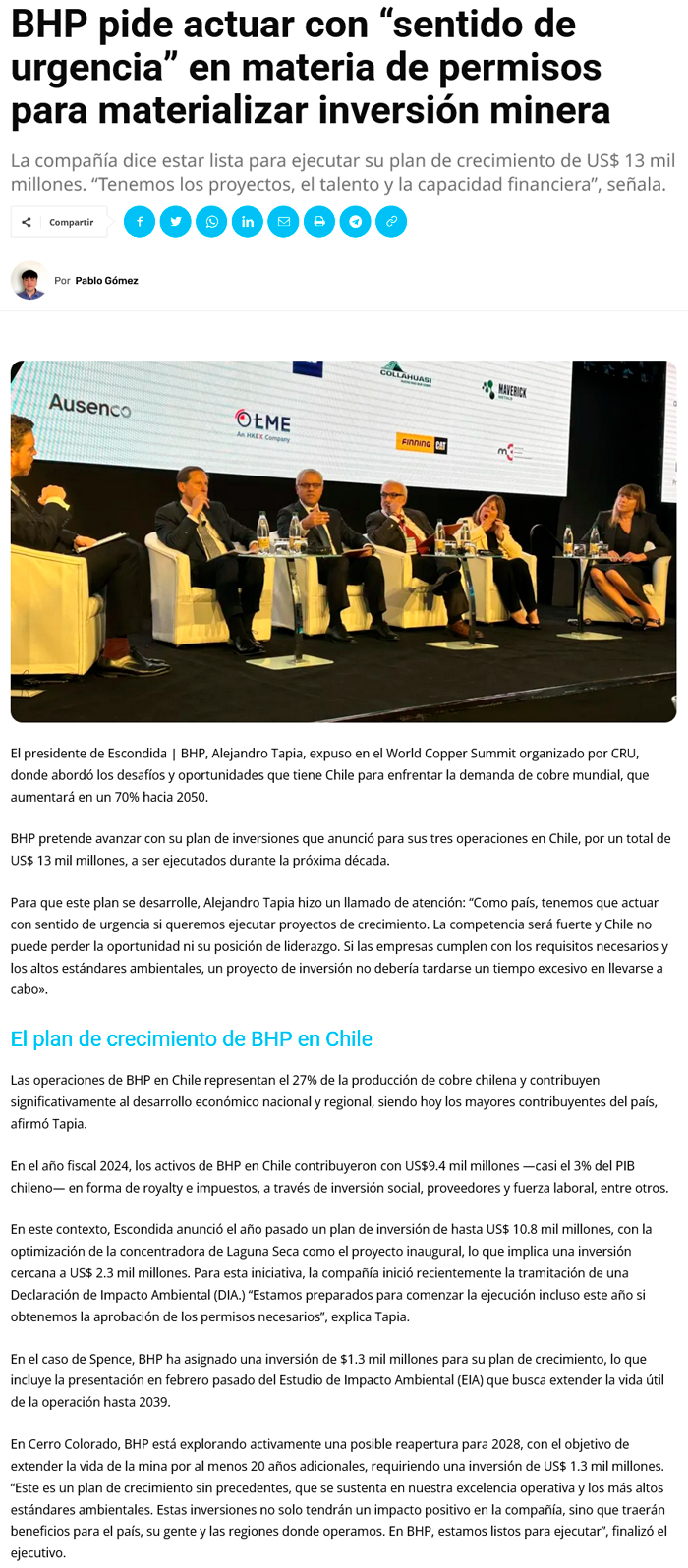 BHP pide actuar con “sentido de urgencia” en materia de permisos para materializar inversión minera - (calamaenlinea.cl)
