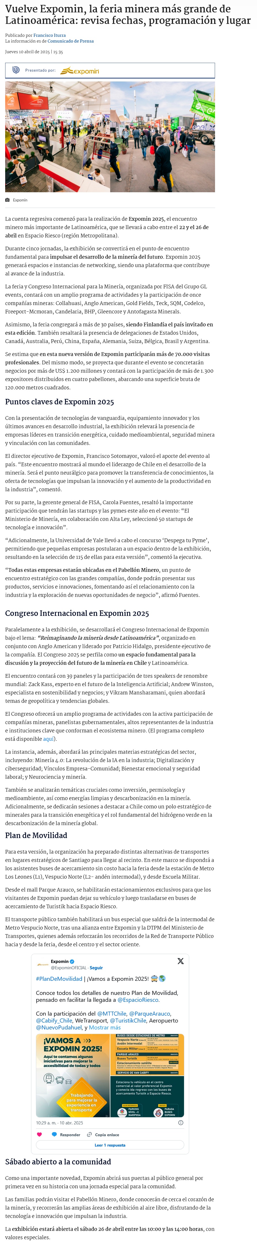 Todo preparado para Expomin 2025: el mayor encuentro de la minería en Latinoamérica comienza este 22 de abril - (reporteminero)