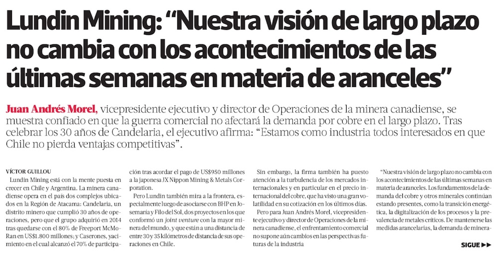 Lundin Mining: “Nuestra visión de largo plazo no cambia con los acontecimientos de las últimas semanas en materia de aranceles” - (La Tercera Online)