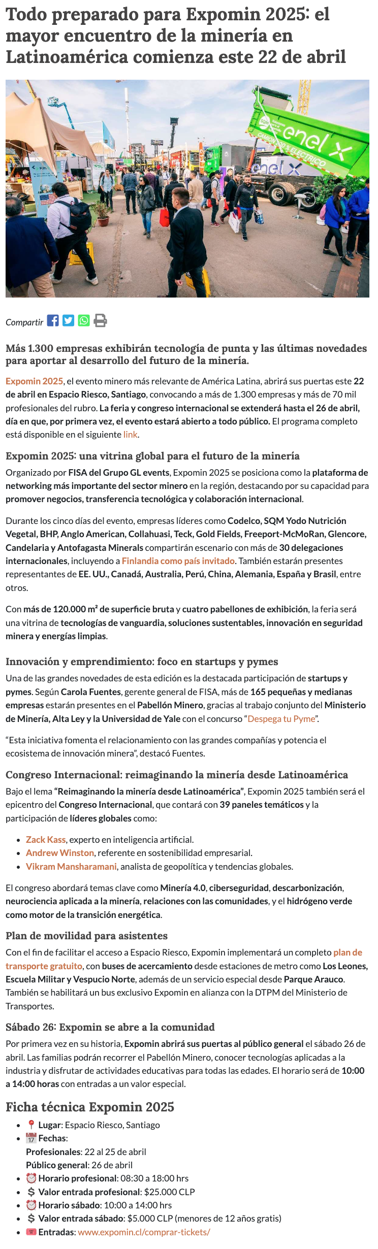 Todo preparado para Expomin 2025: el mayor encuentro de la minería en Latinoamérica comienza este 22 de abril en Santiago - (portalminero)