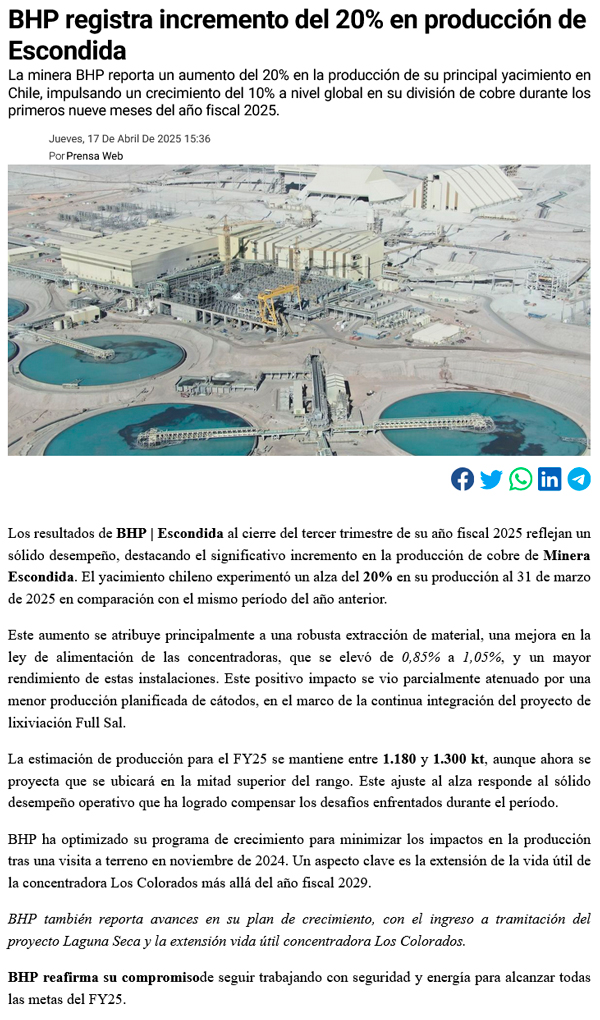 Escondida lidera nuevo récord de producción de cobre de BHP durante los primeros nueve meses del año fiscal 2025 - (mineriayfuturo.cl)