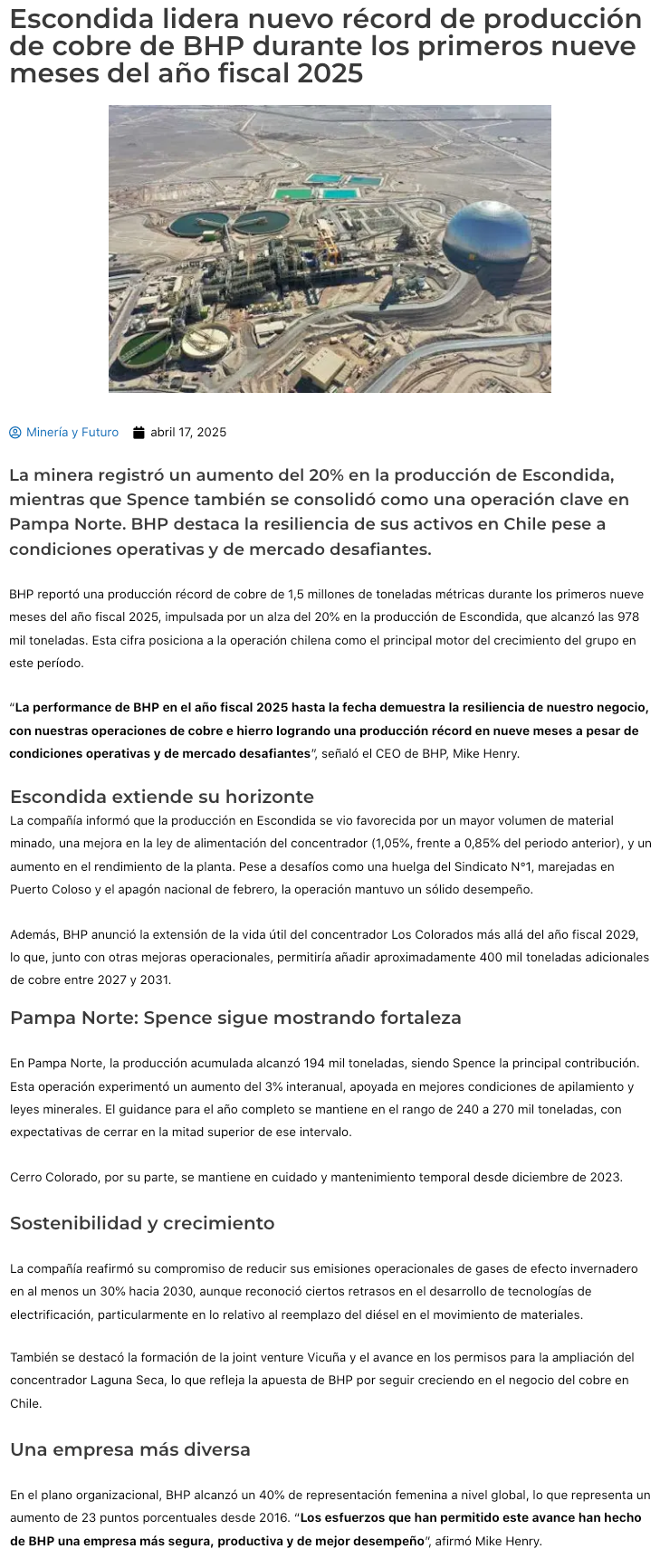 BHP reporta récord de producción en Escondida con 978 mil toneladas de cobre en marzo 2025, superando desafíos operativos - (redimin)