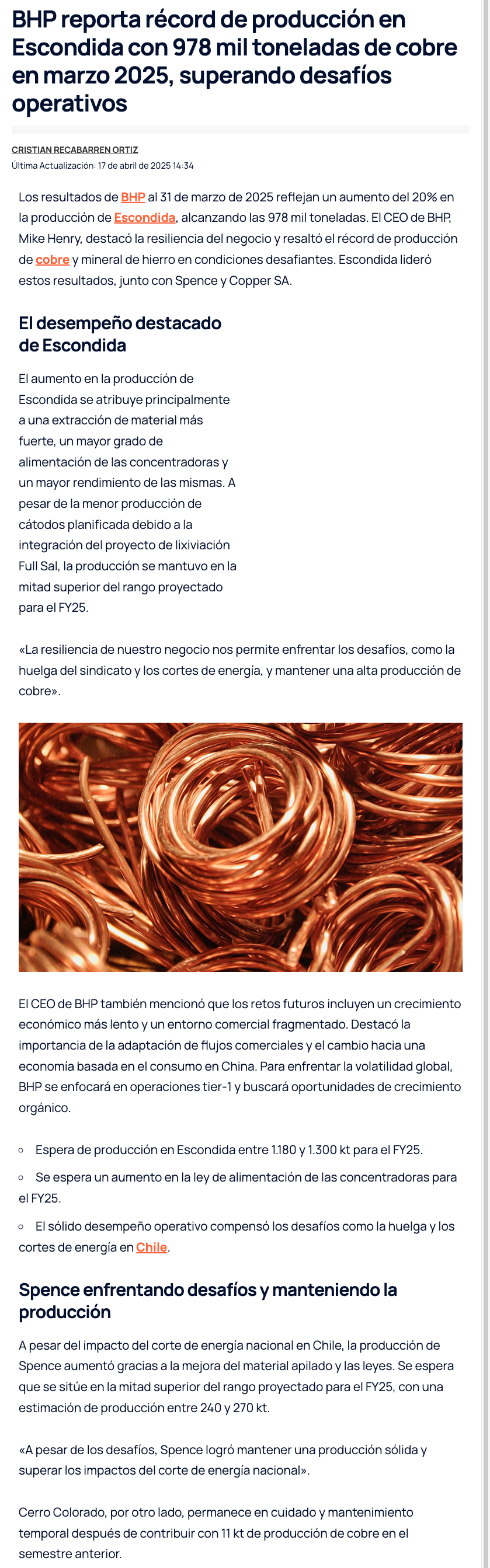 Escondida lidera nuevo récord de producción de cobre de BHP durante los primeros nueve meses del año fiscal 2025 - (mineriayfuturo.cl)