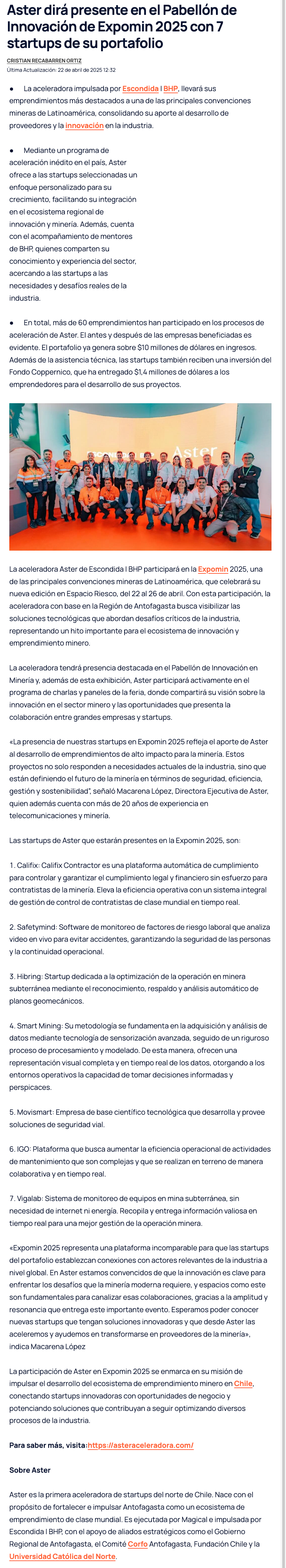Aster dirá presente en el Pabellón de Innovación de Expomin 2025 con 7 startups de su portafolio - (portalinnova.cl)