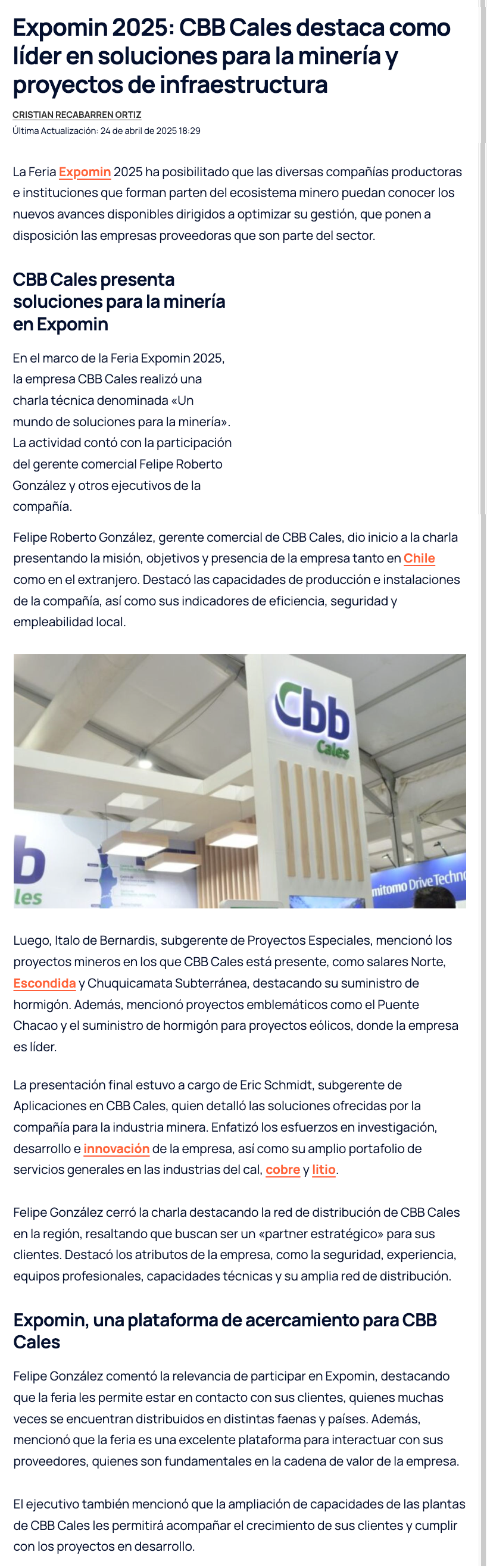 CBB Cales presenta en Expomin 2025 sus soluciones para una minería más sostenible - (mch.cl)