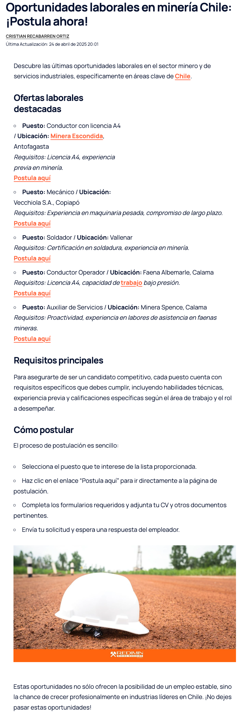 Oportunidades laborales en sector minero de Calama: Postula ahora - (redimin)