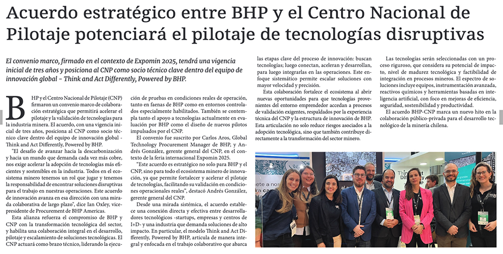 BHP y Centro Nacional de Pilotaje firman alianza estratégica para acelerar tecnologías disruptivas en minería - (mineriayfuturo.cl)