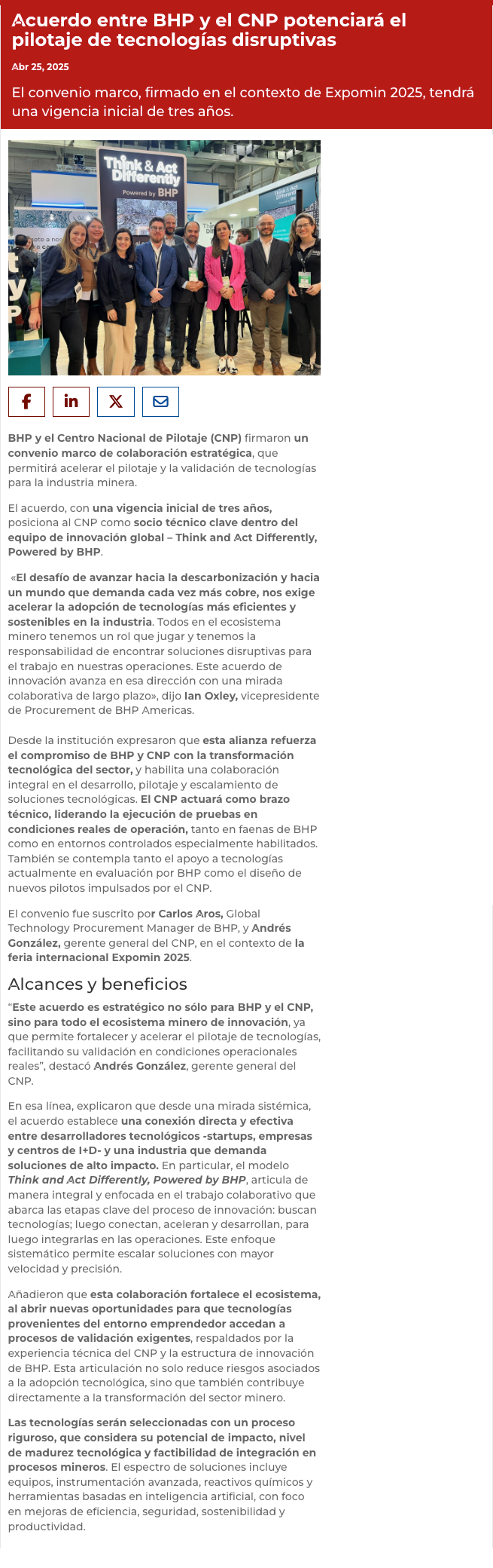 BHP y Centro Nacional de Pilotaje firman alianza estratégica para acelerar tecnologías disruptivas en minería - (mineriayfuturo.cl)