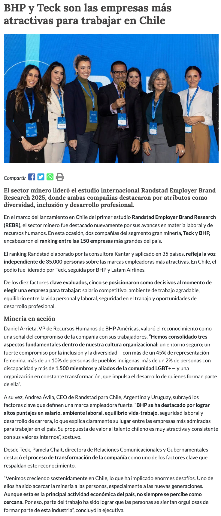 Minería Chilena Lidera en Atracción Laboral: Teck y BHP Encabezan el Estudio Randstad Employer Brand Research 2025 - (redimin)
