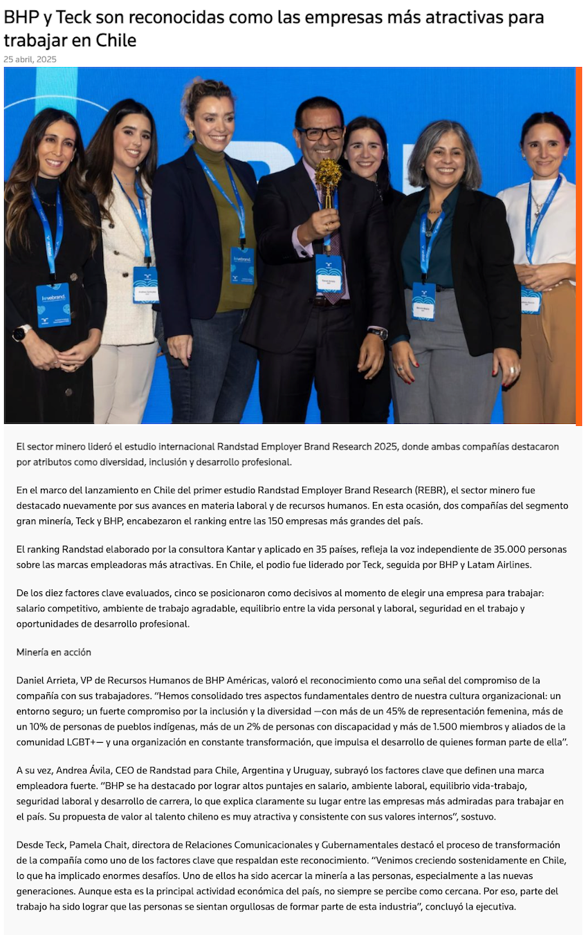 Minería Chilena Lidera en Atracción Laboral: Teck y BHP Encabezan el Estudio Randstad Employer Brand Research 2025 - (redimin)