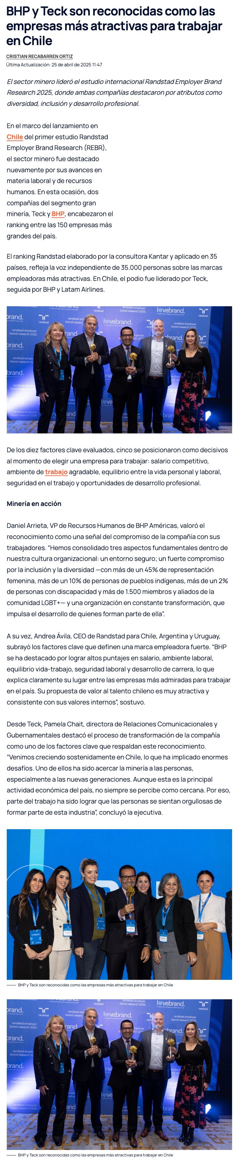 Minería Chilena Lidera en Atracción Laboral: Teck y BHP Encabezan el Estudio Randstad Employer Brand Research 2025 - (redimin)