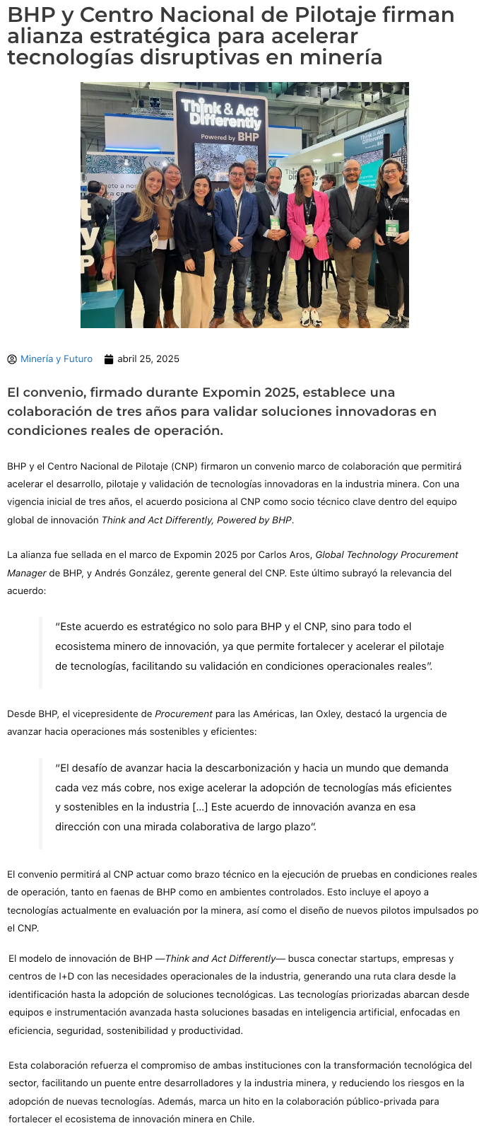 Acuerdo estratégico entre BHP y el Centro Nacional de Pilotaje potenciará el pilotaje de tecnologías disruptivas - (Nostálgica Online)