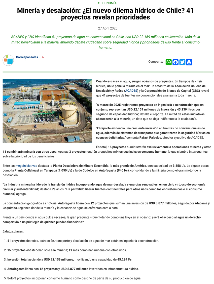 Minería y desalación: ¿El nuevo dilema hídrico de Chile? 41 proyectos revelan prioridades - (elboyaldia)