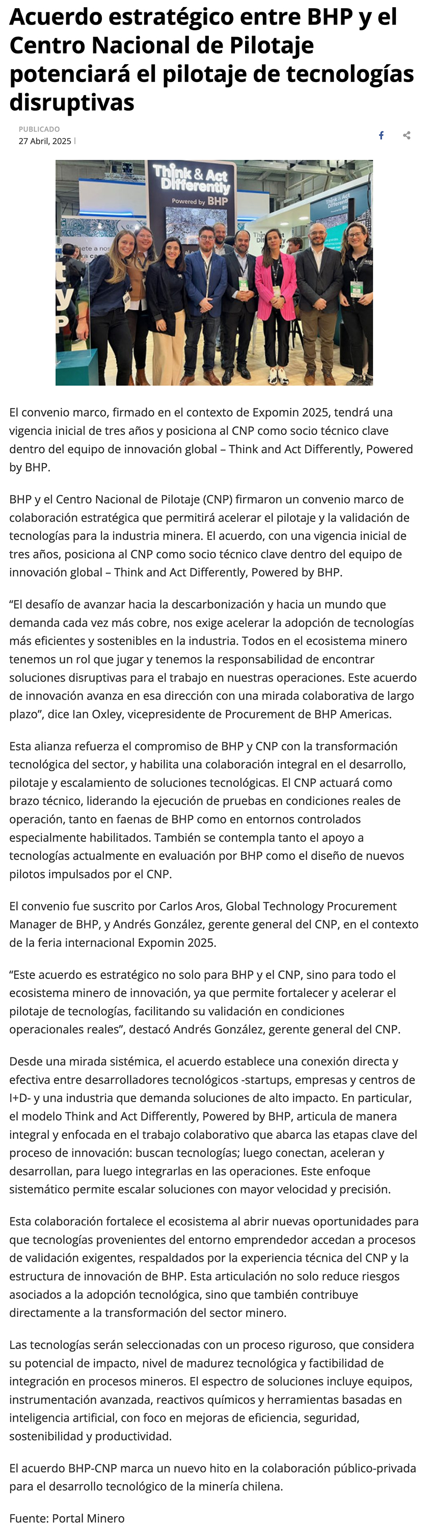 BHP y Centro Nacional de Pilotaje firman alianza estratégica para acelerar tecnologías disruptivas en minería - (mineriayfuturo.cl)