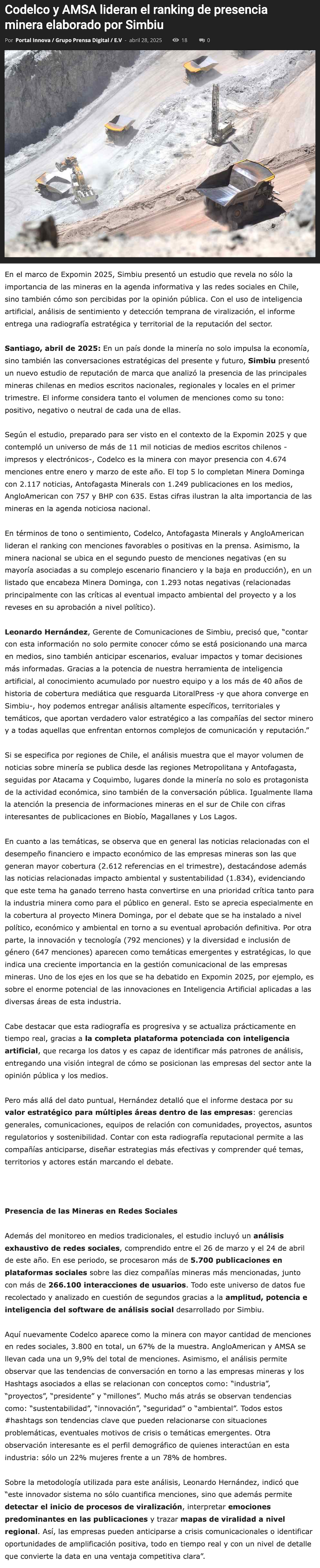 Codelco y AMSA lideran el ranking de presencia minera elaborado por Simbiu - (portalminero)