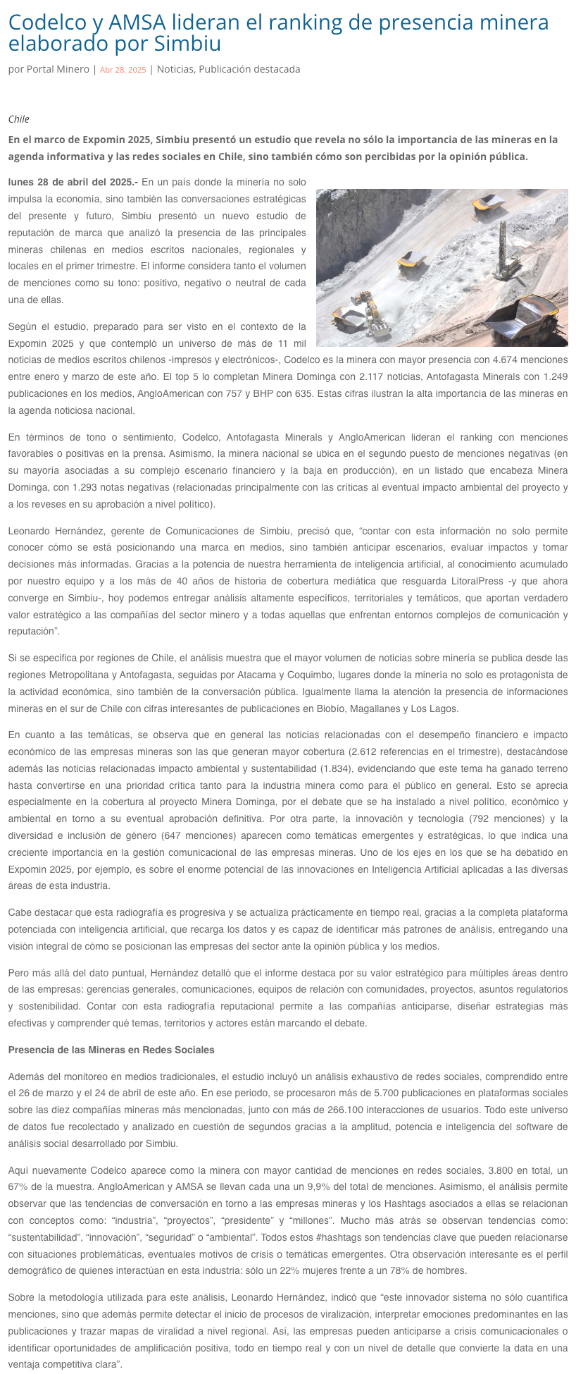 Codelco y AMSA lideran el ranking de presencia minera elaborado por Simbiu - (portalinnova.cl)