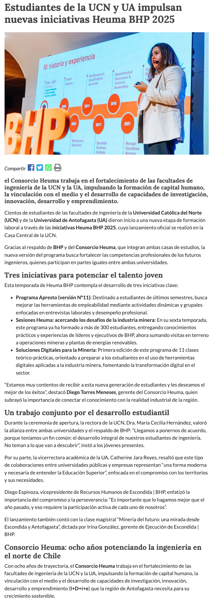 Programa Heuma BHP 2025 potencia la formación de ingenieros en UCN y UA con apoyo de BHP y sesiones prácticas en minería - (redimin)