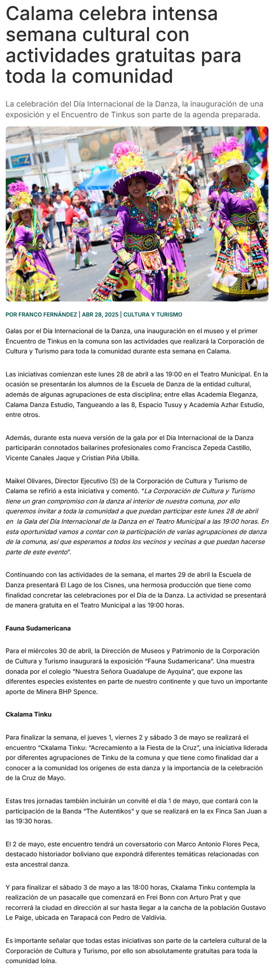 Interesantes actividades culturales proponen la Corporación de Cultura y Turismo para esta semana en Calama - (desiertofm.cl)