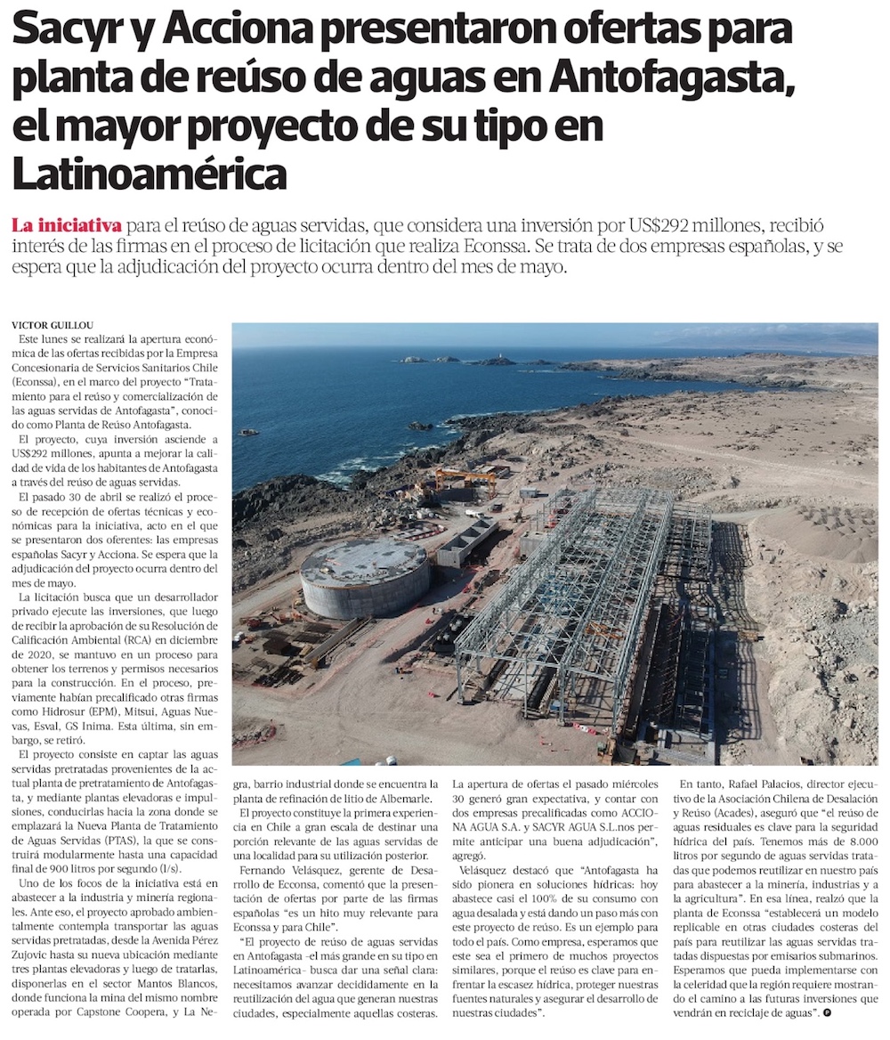 Sacyr presentó la mejor oferta por proyecto de reúso de aguas en Antofagasta - (El Mercurio de Santiago)