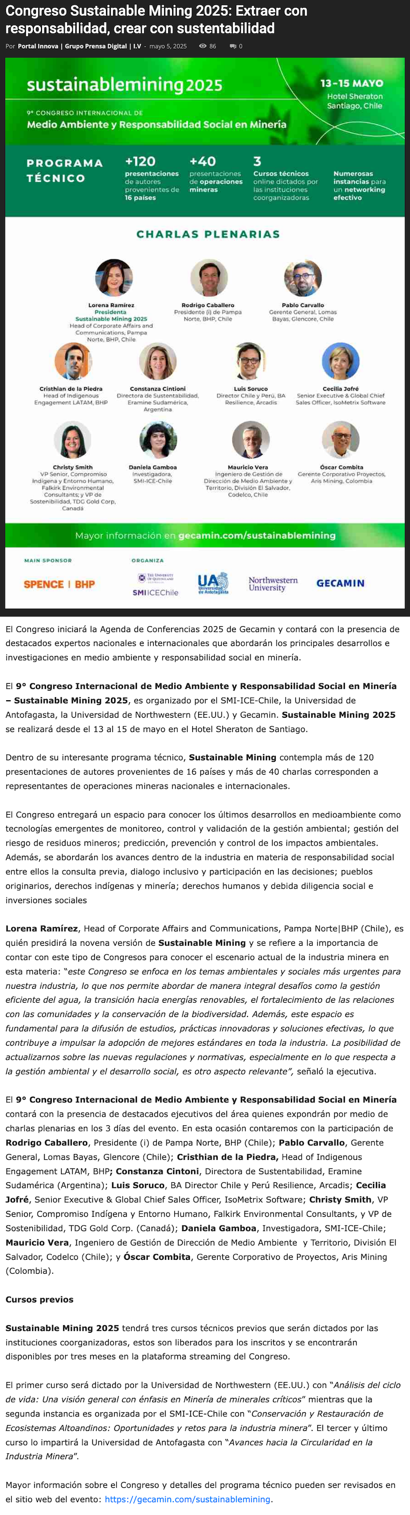 Congreso Sustainable Mining 2025: Extraer con responsabilidad, crear con sustentabilidad - (portalinnova.cl)