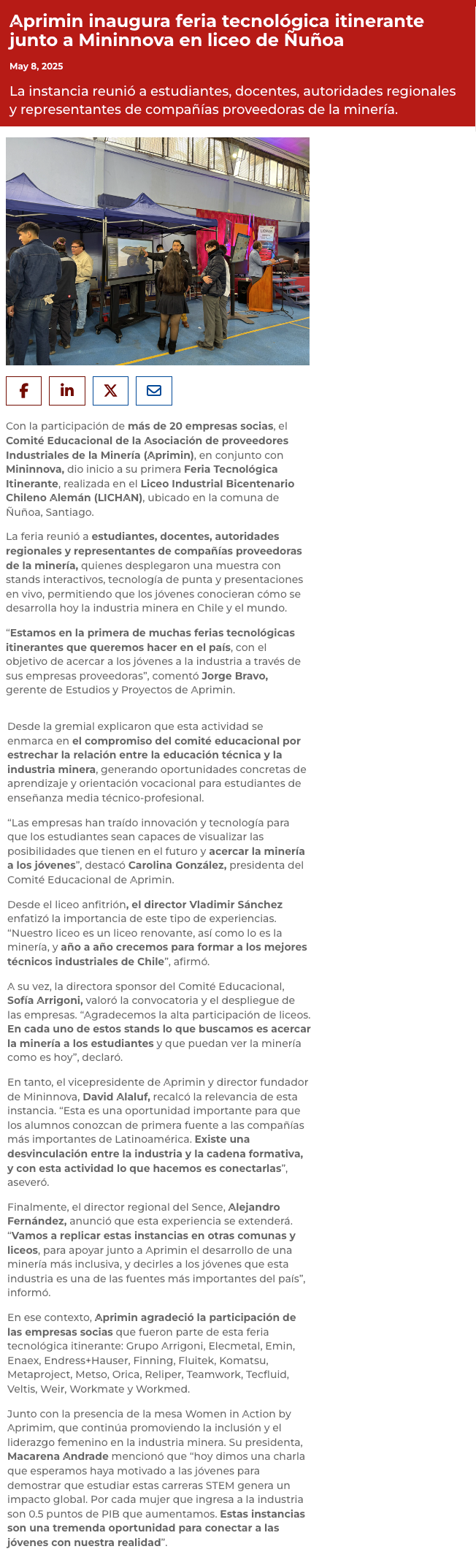 Con más de 20 empresas: APRIMIN lanza su primera Feria Tecnológica Itinerante en liceo de Ñuñoa - (madero.cl)