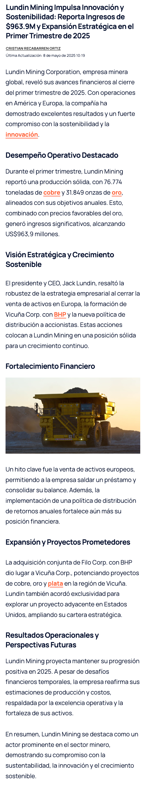 Lundin Mining destaca rendimientos de Candelaria y Caserones en positivos resultados del primer trimestre - (electromineria.cl)