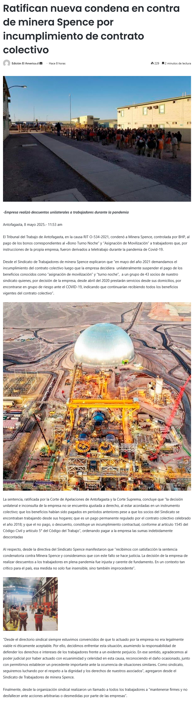 Tribunal ordena pago de bonos a trabajadores de Spence que estuvieron en teletrabajo - (soyantofagasta)