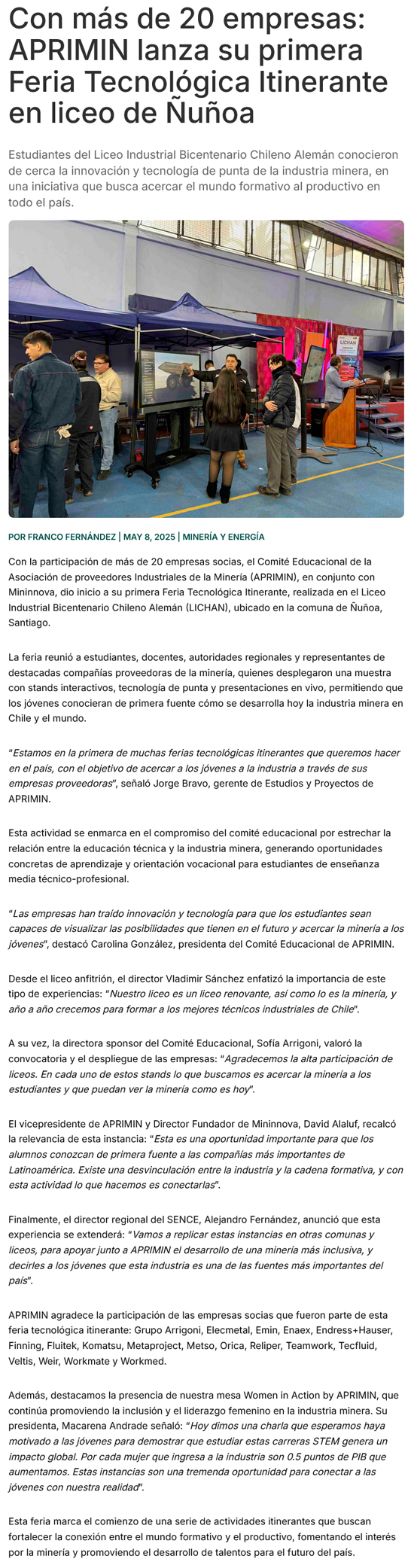 Aprimin inaugura feria tecnológica itinerante junto a Mininnova en liceo de Ñuñoa - (mch.cl)