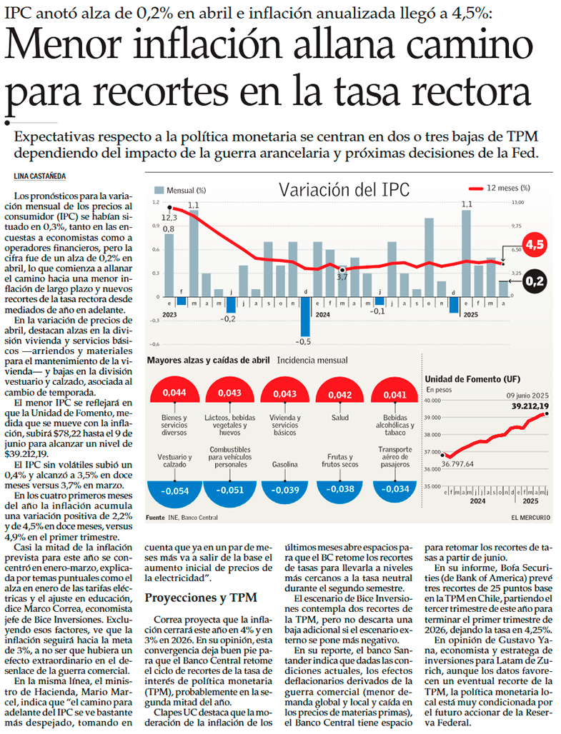 Alza del IPC menor a la esperada en abril refuerza apuestas de inflación en 4% a diciembre y una baja de tasas en junio - (Diario Financiero)