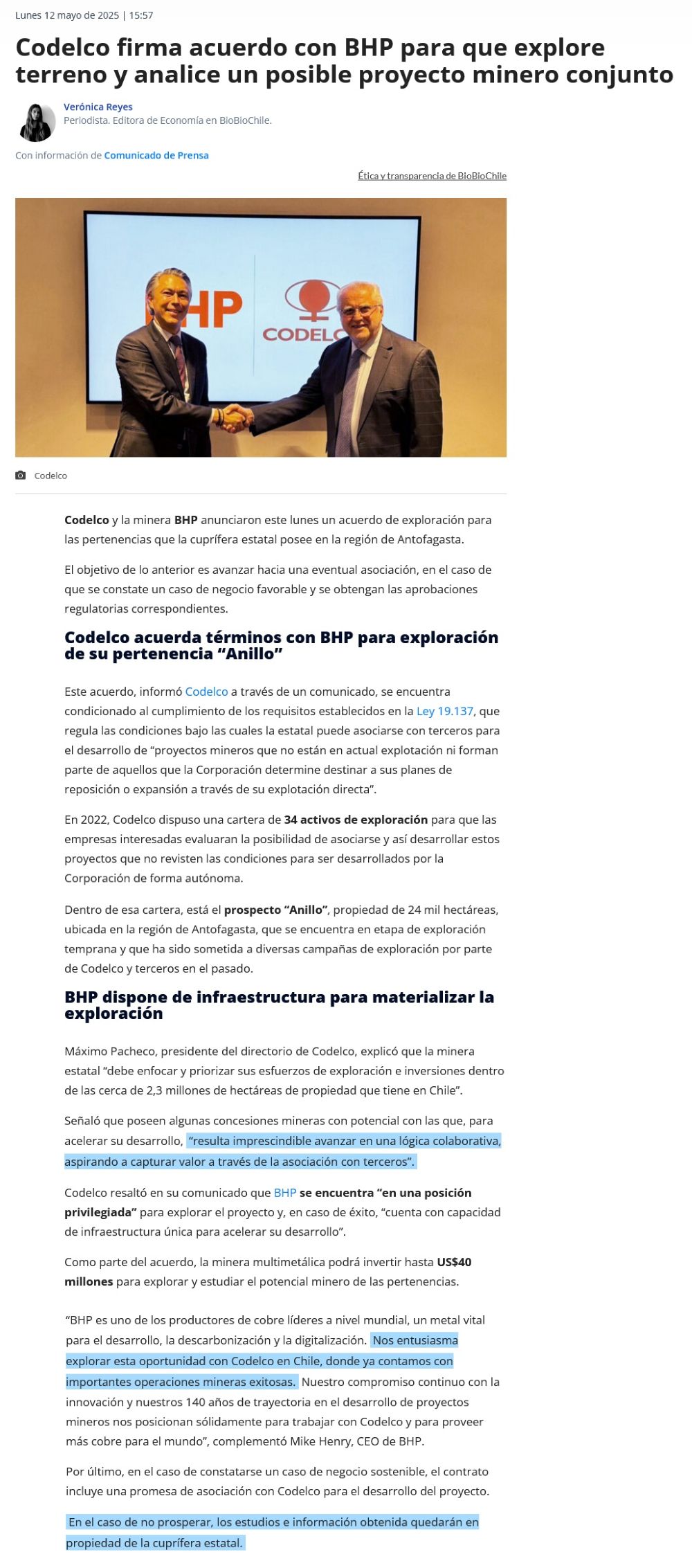 Codelco acuerda términos y condiciones con BHP para exploración de pertenencia en la Región de Antofagasta - (mch.cl)