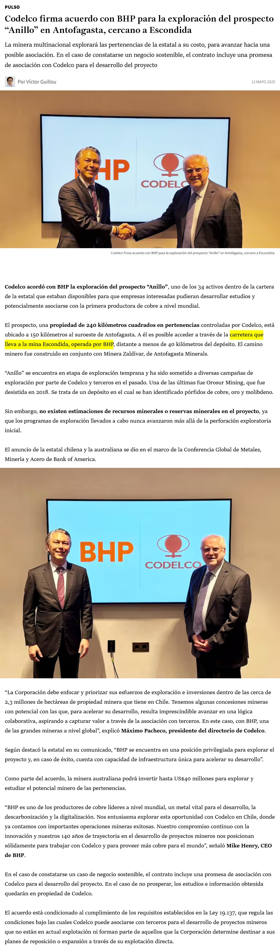 Codelco acuerda términos y condiciones con BHP para exploración de pertenencia en la Región de Antofagasta - (mch.cl)