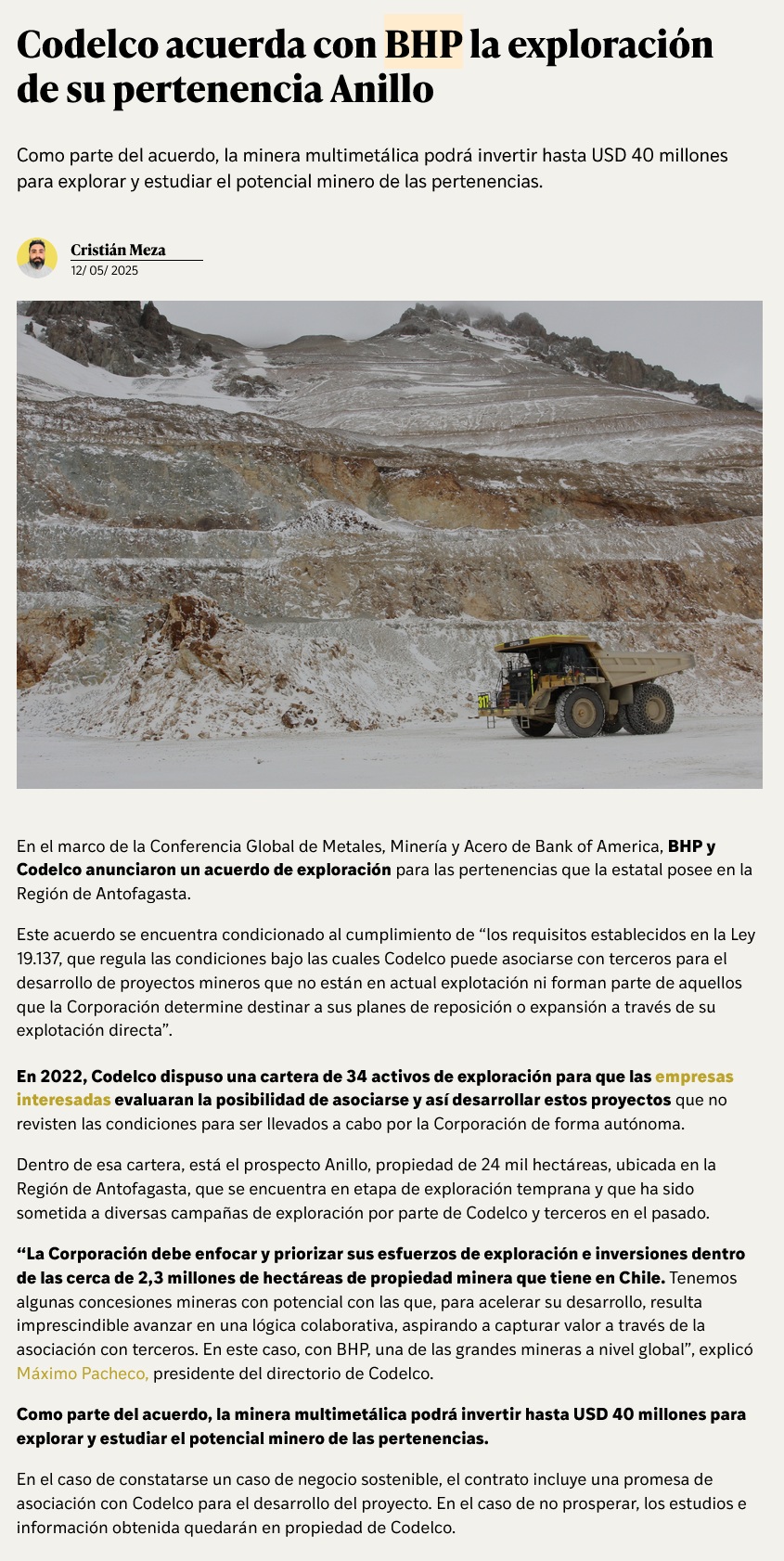 Codelco acuerda términos y condiciones con BHP para exploración de pertenencia en la Región de Antofagasta - (mch.cl)
