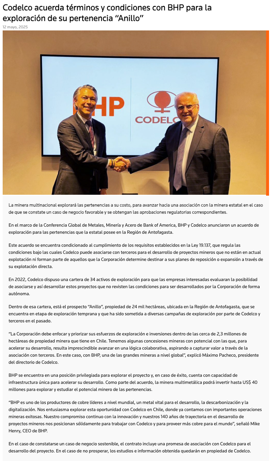 Codelco acuerda términos y condiciones con BHP para exploración de pertenencia en la Región de Antofagasta - (mch.cl)